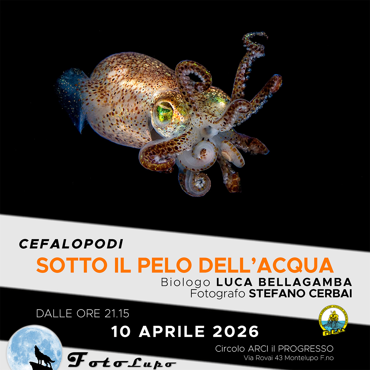 Per maggiori informazioni: https://www.fotolupo.info/anteprima-10-aprile-2026-sotto-il-pelo-dellacqua-cefalopodi-con-stefano-cerbai-e-luca-bellagamba/